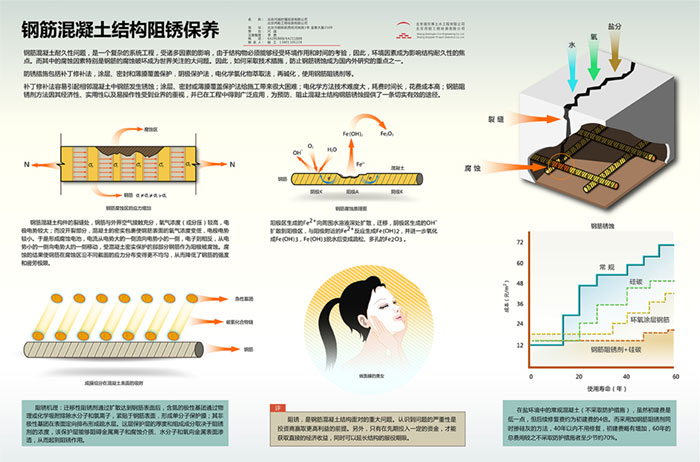 防锈措施包括补丁修补法,涂层,密封和薄膜覆盖保护,阴极保护法,电化学氯化物萃取法,再碱化,使用钢筋阻锈剂等。