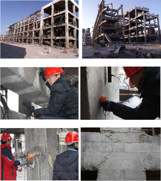 1、工程概况:本工程为山西省某化工厂聚合车间厂房检测工程,该工程为框架结构,2010年11月,位于东区一层1-3层轴之间的聚合车间发生爆炸,其一至二层主体结构受爆炸冲击波冲击较严重,框架梁、柱混凝土结构承载力受损,并出现大量裂缝,及部分柱变形。受甲方委托对该建筑物进行检测及安全鉴定。