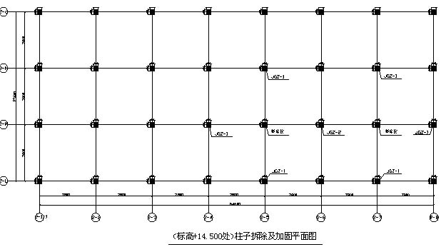1)        托梁拔柱:共拆除标高7.300—14.500处柱子两根,相应加固混凝土梁7根、加固混凝土柱7根;