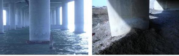 以上的病害特征在北方地区的桥梁中应该是普遍的现象——就是墩拄根部的盐腐蚀和盐冻,如图3。