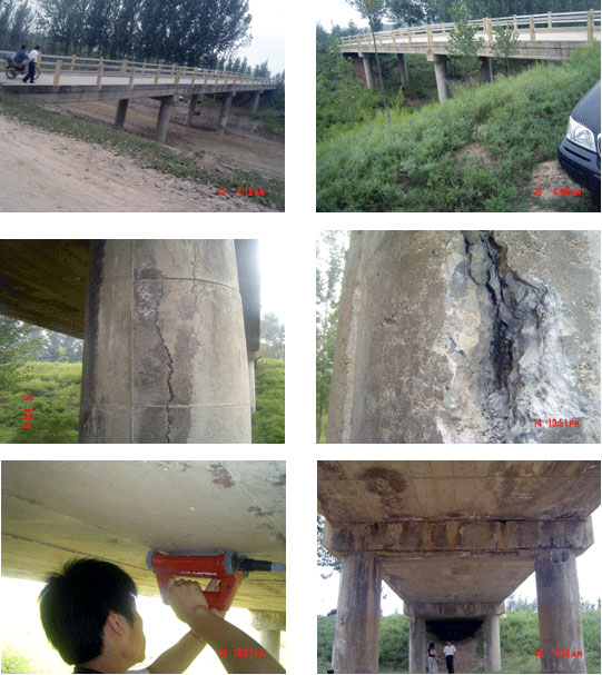 1、工程概况:此桥建于1987年12月,井柱、盖梁和空心板皆为现浇钢筋混凝土构件,混凝土原设计强度为250#,包括斜桥和平桥两部分。斜桥为四跨梁板桥,总长58.84米,总宽5.00米。平桥为三跨梁板桥,总长42.20米,总宽5.00米。