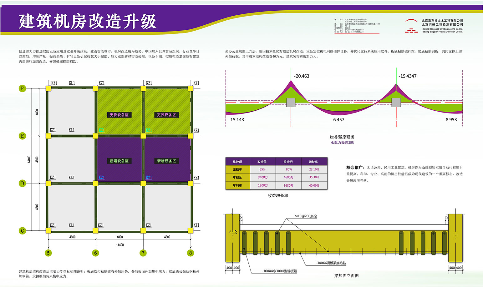 建筑机房结构改造后主要力学指标如图说明:板底均匀粘贴碳布外加压条,分散板面外加集中应力;梁底通长张贴钢板外加钢箍,承担框梁传来集中应力。