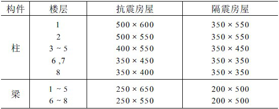 隔震房屋的首层是商场,层高3.6m, 其余各层均为住宅用房, 层高3.0m, 房屋8层, 地面以上高度为24.6m, 为便于进行技术比较, 在与该隔震房屋相距1.6m处建造了一栋按常规方法设计的、上部结构平立面布置与隔震房屋完全相同的普通抗震房屋,但两栋房屋的构件截面与配筋不同,隔震房屋的构件要弱很多,构件断面见表1,其余结构参数见文[3]、[4]。