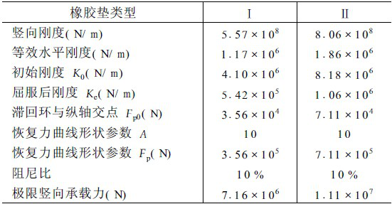 根据图2所示橡胶垫力学性能试验曲线,按文[1]所述方法得到两种橡胶垫的各项性能参数,见表2。值得注意的是,该结构中使用的两类橡胶垫的阻尼比都偏小,为10%左右,目前工程常用的橡胶垫阻尼比则大都在20%左右。