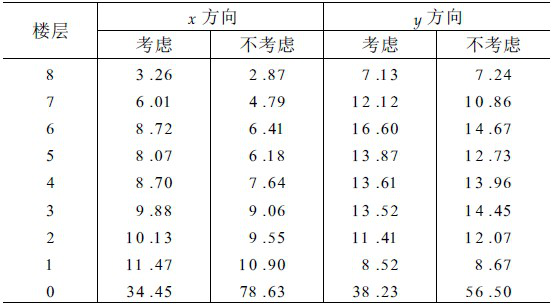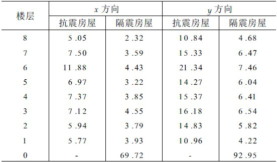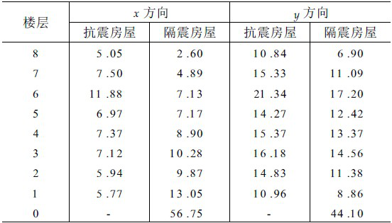 表4列出了抗震结构和隔震结构在双向地震波作用下各楼层的最大层间位移。从其中可以看出