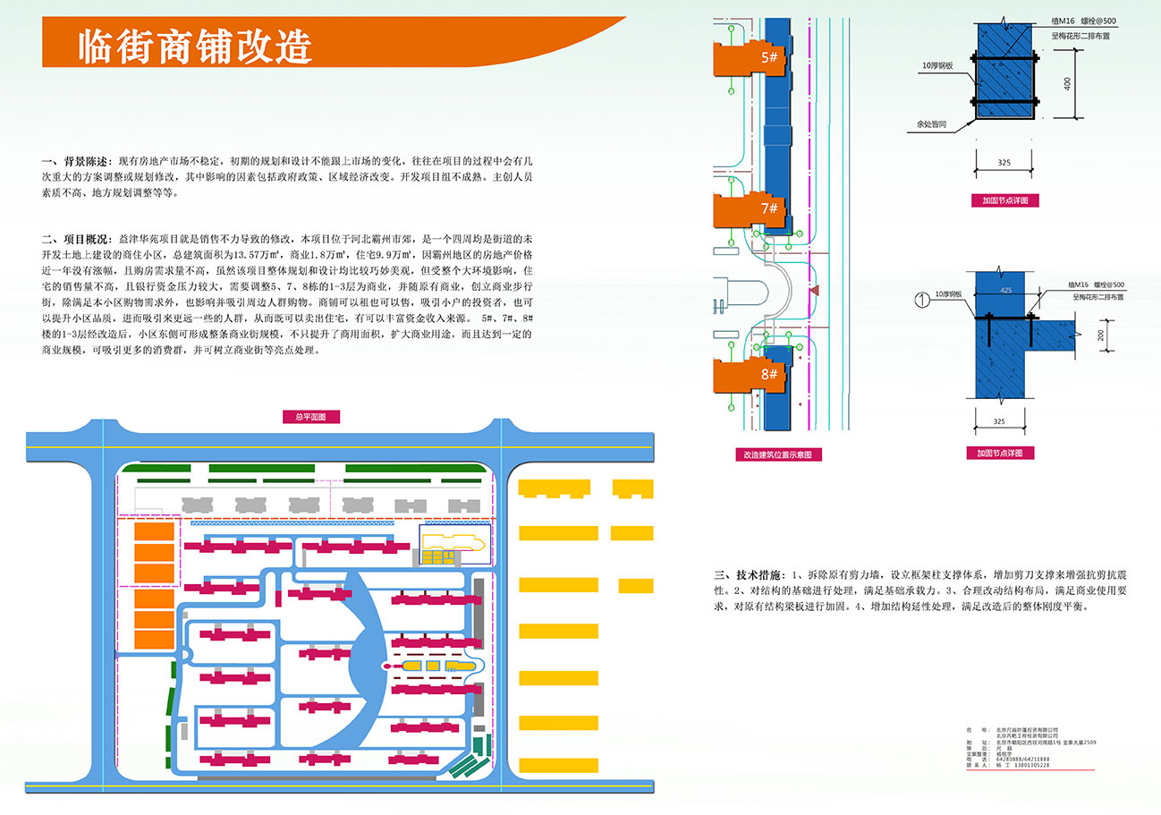二、项目概况:益津华苑项目就是销售不力导致的修改,本项目位于河北霸州市郊,是一个四周均是街道的未开发土地上建设的商住小区,总建筑面积为13.57万㎡,商业1.8万㎡,住宅9.9万㎡,因霸州地区的房地产价格近一年没有涨幅,且购房需求量不高,虽然该项目整体规划和设计均比较巧妙美观,但受整个大环境影响,住宅的销售量不高,且银行资金压力较大,需要调整5、7、8栋的1-3层为商业,并随原有商业,创立商业步行街,除满足本小区购物需求外,也影响并吸引周边人群购物。商铺可以租也可以售,吸引小户的投资者,也可以提升小区品质,进而吸引来更远一些的人群,从而既可以卖出住宅,有可以丰富资金收入来源。5#、7#、8#楼的1-3层经改造后,小区东侧可形成整条商业街规模,不只提升了商用面积,扩大商业用途,而且达到一定的商业规模,可吸引更多的消费群,并可树立商业街等亮点处理。