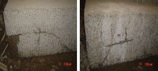 该建筑物大部分基础桩承台在施工过程中,非一次性浇筑完成,而且,浇筑间隔较长,该部分基础桩承台的后浇部分至少是在前期浇筑部分的混凝土达到前期强度才浇筑后期部分,这样就造成了基础桩承台产生图1所示意的施工缝的存在 ,施工缝的存在导致基础承台的抗冲切高度不够而发生图片9/D和12/C所示的冲切破坏。