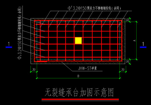 本方案采用预应力钢铰线在承台外围进行约束包裹,预防裂缝的产生,并能在裂缝产生的情况下,有效阻止裂缝的开展。在外部抹30mm厚JHM-ST砂浆,能有效阻止外部不利因素的侵入,起到保护层的作用。