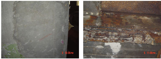 6、部分次梁钢筋锈蚀原因分析:此处梁上方为设备洞口,腐蚀性液体沿洞口流下侵蚀混凝土,同时周围存在腐蚀性气体介质(特别是氯离子),腐蚀性液体及气体侵蚀到钢筋部位,使之逐渐生锈,钢筋生锈后体积膨胀,引起混凝土沿钢筋开裂。混凝土裂缝的开展,反过来又促使钢筋更快锈蚀。现场湿度大,加速了这种恶性循环。